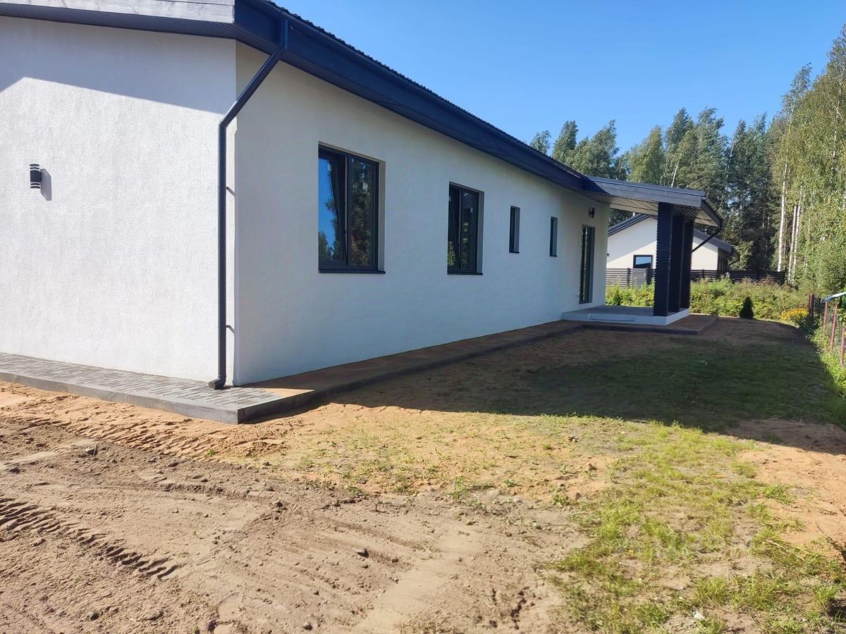 Участок ровный и сухой, проведены работы по подъёму уровня земли песком и плодородным грунтом. Также сделана въездная группа и отсыпана парковка для нескольких автомобилей. От части проведены ландшафтные работы, уже есть зеленые декоративные насаждения.