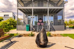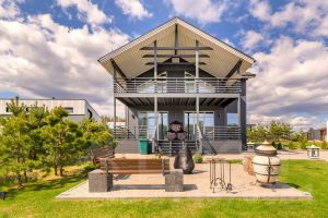 большую светлую гостиную с камином и выходом на террасу к зоне барбекю