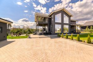 На участке сделано мощение, засеян газон, организованная барбекю зона и высажены туи и молодые сосны.