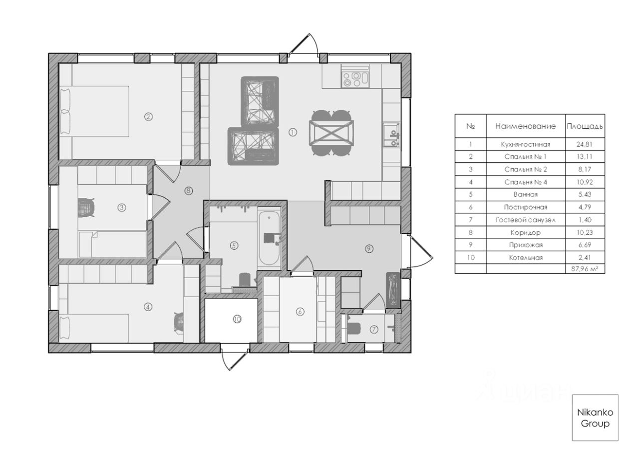 Площади: внутренние помещения 88,04 м²; терраса 72 м². Кухня-гостиная: 24,8 м². Спальни 8-13 м². Основной санузел с ванной 5,48 м². Кладовая-Постирочная 4,79 м².