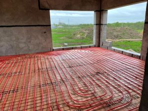 Отопление - водяной тёплый пол от электрического котла 9 кВт - 1 этаж; радиаторы - 2 этаж