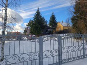 Участок имеет легкий уклон, за счет чего он всегда сухой. Огорожен кованым забором.