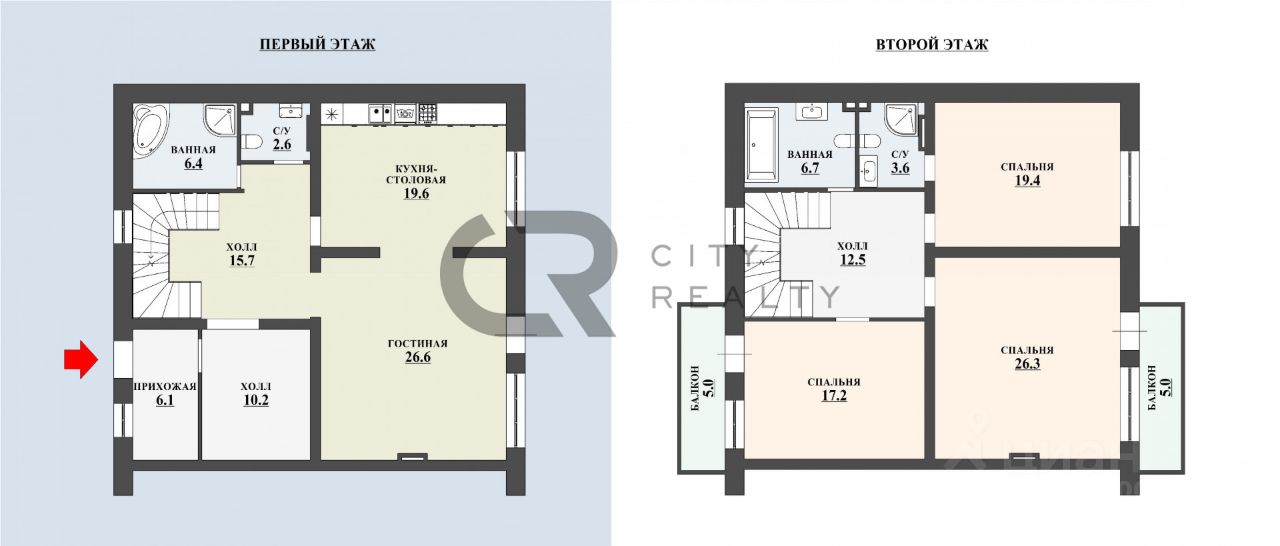 2 этажа, 3 спальни, кухня-гостиная, гардеробная, 2 балкона, 4 сан.узла.