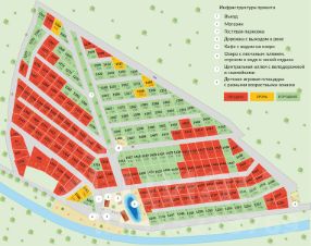 Оснащение: дороги - ЩПС, собственный парк для отдыха и занятий спортом, прогулочные зоны, магазин на территории поселка.