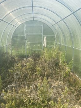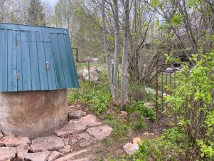 Шлагбаум на въезде в садоводство. Солнечный, ровный, квадратный. Вокруг участка дренажная канава. Рядом с участком колодец. На участке плодовые деревья и кустарники. Большая теплица и бытовка. Сделано межевание. Также на участке находится недостроенный дом.