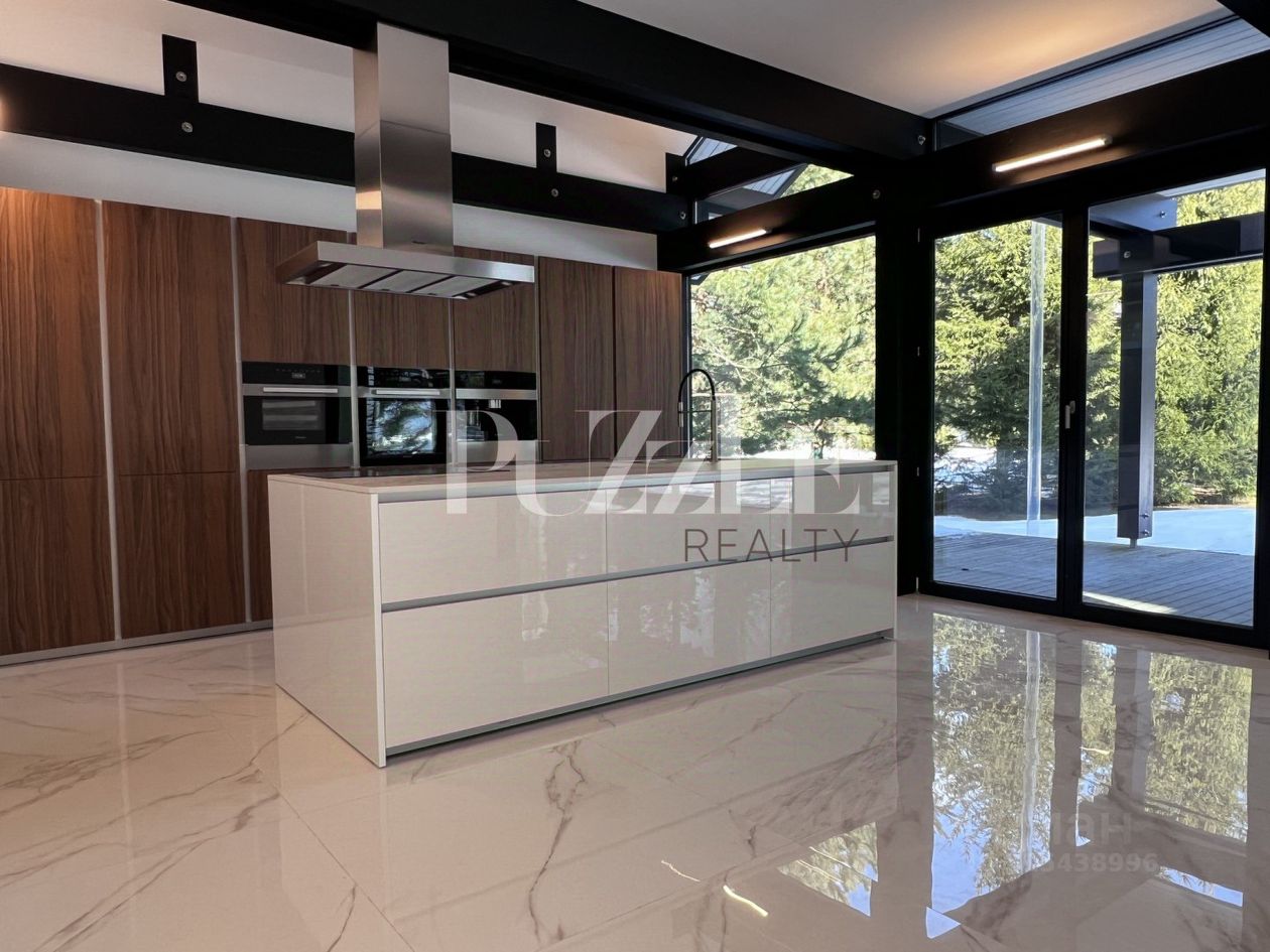 На первом этаже располагается просторная гостиная площадью 50 кв. м с выходом на террасу, где можно проводить время в кругу семьи или с друзьями. Вдобавок к этому, имеется уютная столовая (15.9 кв. м), современная кухня площадью 23 кв. м, холл (15.9 кв. м), а также сауна (8 кв. м) и удобный санузел (8 кв. м). Дом с современным панорамным остеклением, которое заполняет дом светом и создает ощущение простора.