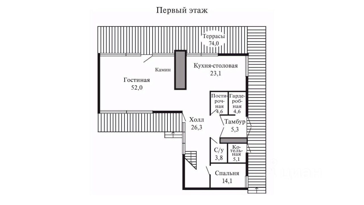 тамбур с гардеробной, холл с выходом на террасу, спальня, санузел, гостиная и кухня - столовая с выходом на террасу, котельная, подсобное помещение.