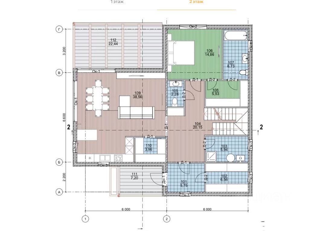Площадь террасы 1 этаж — 22,4 м²