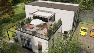 О ДОМЕ: FP-3+ двухэтажный дом с тремя спальнями, гардеробной, технической комнатой и санузлом. Кухня-гостиная с панорамным остеклением и террасой.