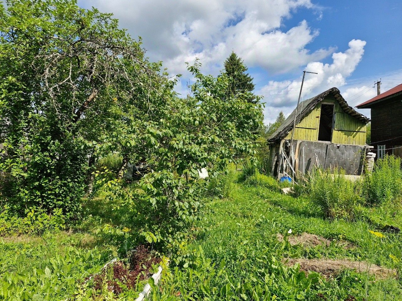 Участок ухожен есть многолетние цветы, яблони. Воду можно брать на колонке общего пользования, она в пешей доступности от дома.