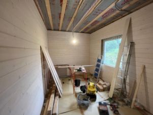 2 спальни: имитация бруса камерной сушки, окрашено белой лазурью итальянского производства в 2 слоя (1 слой до монтажа, второй - после).