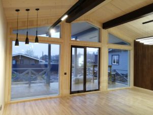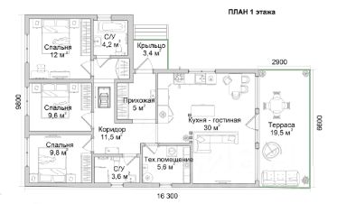 • кухня-гостиная 30 м² с панорамным остеклением, высокими потолками и выходом на крытую террасу,
