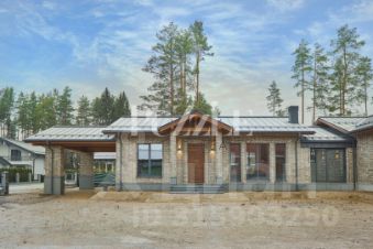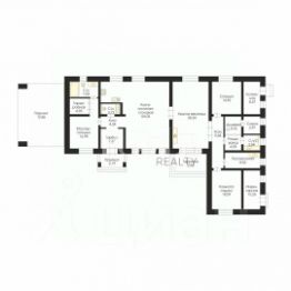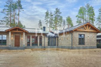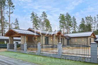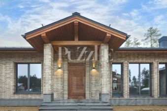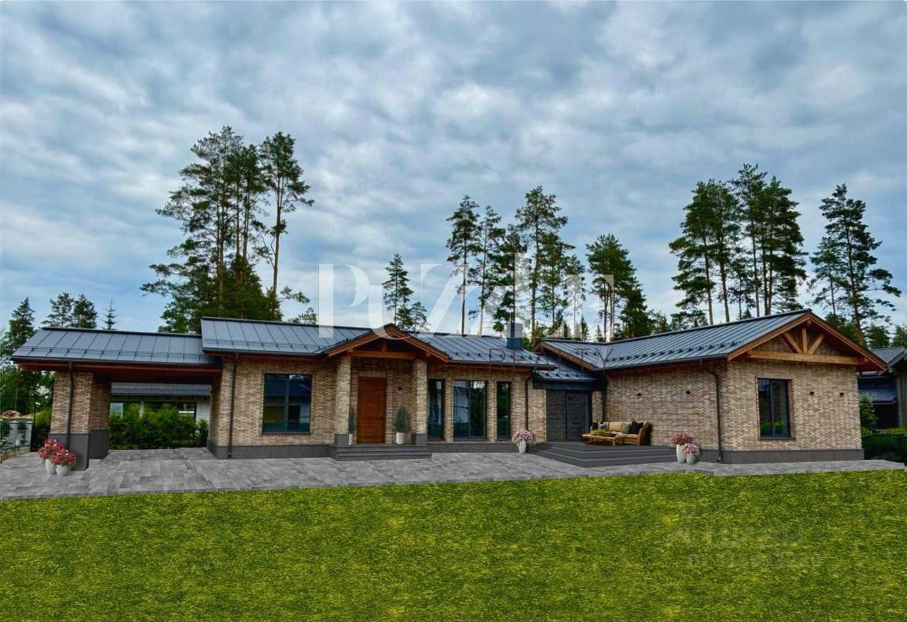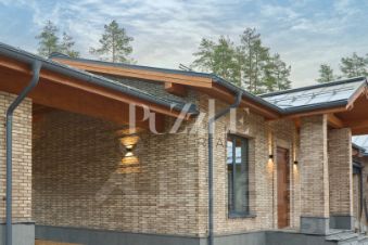 Одноэтажный дом с продуманной эргономикой пространства: кухня-гостиная 54 м2, мастер-спальня 17 м2 + санузел 7 м2 + гардеробная 5 м2, 3 спальни, сауна, санузел, постирочная. Архитектурная идея дома состояла в том, чтобы объединить зоны различного назначения по одной кровлей, в т.ч. автомобильный навес для двух автомобилей, жилые пространства, зона приготовления пищи для пикника, техническое помещение, помещение хозяйственно-бытового назначения. Два последних помещения имеют отдельные входы. В мангальной зоне дома выполнено основание под террасу в соответствие с проектом.