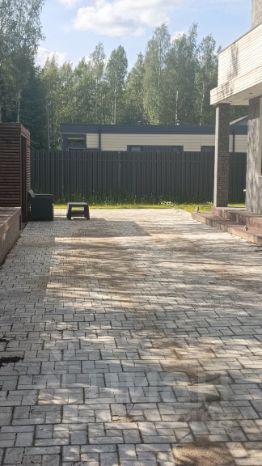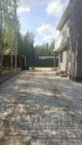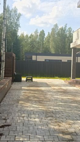 Также дом огражден забором (штакетник + колонны с габионом)