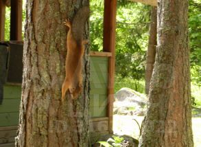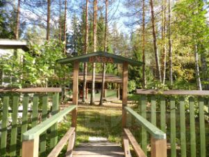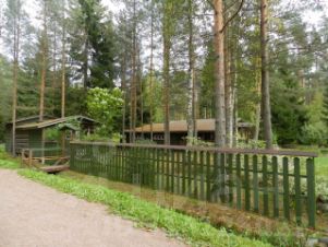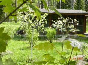 Все постройки выполнены в едином стиле и выкрашены в один цвет. Участок с трех сторон окружен лесом, полное единение с природой. Растут ели, сосны, есть своя небольшая березовая роща. Перед домом камень-валун оставили нетронутым разбив вокруг небольшие цветники.