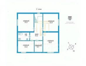 Второй этаж высота потолка 2,88м - 4 спальни по 23,23,24 и 13,5 м2, гардероб 6,3 м2, холл 15,2 м2 и санузел 8м2.