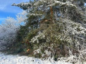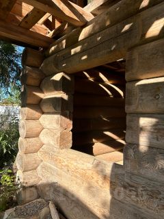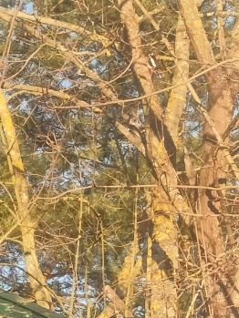 На 42 фото видно дятла. Он прилетает на Клён к гостевому домику из бревна.