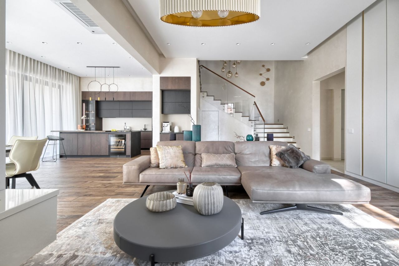 Планировочное решение резиденции продумано до мелочей и отвечает всем современным требованиям: все спальни оборудованы собственными ванными комнатами, просторная светлая кухня-гостиная с панорамными окнами от пола до потолка высотой более 3 м и выходом на открытую террасу, а также собственное патио.