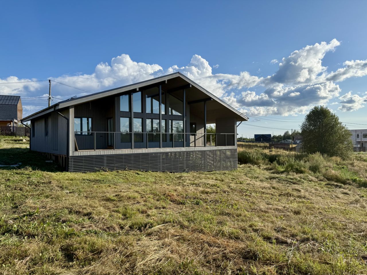 2025 год постройки: из строганой доски с качественным утеплением (стены 200 мм, пол и потолок 250 мм), двойные стеклопакеты. Фасад дома из скандинавской доски с поднятым ворсом.