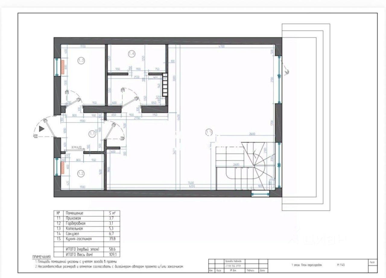 Дом построен по проекту из газобетона (проект предоставим) — общая площадью 140 м². На первом этаже располагается большая кухня - гостиная, гардеробная, тех.помещение и сан.узел.