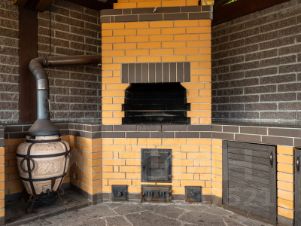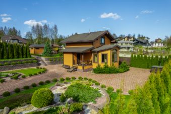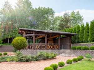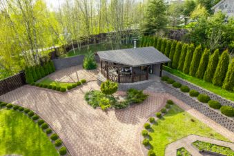 На нижнем уровне - сам дом, декоративный огород, беседка 55м² с полностью оборудованной мангальной зоной (тандыр остается в подарок) с большим запасом дров.