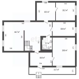 Кухня-гостиная 20 м2, большая гостиная с камином 46 м2, 4 функциональных спальни (10,8 м2, 18,5 м2, 11,7 м2, 17,9 м2),