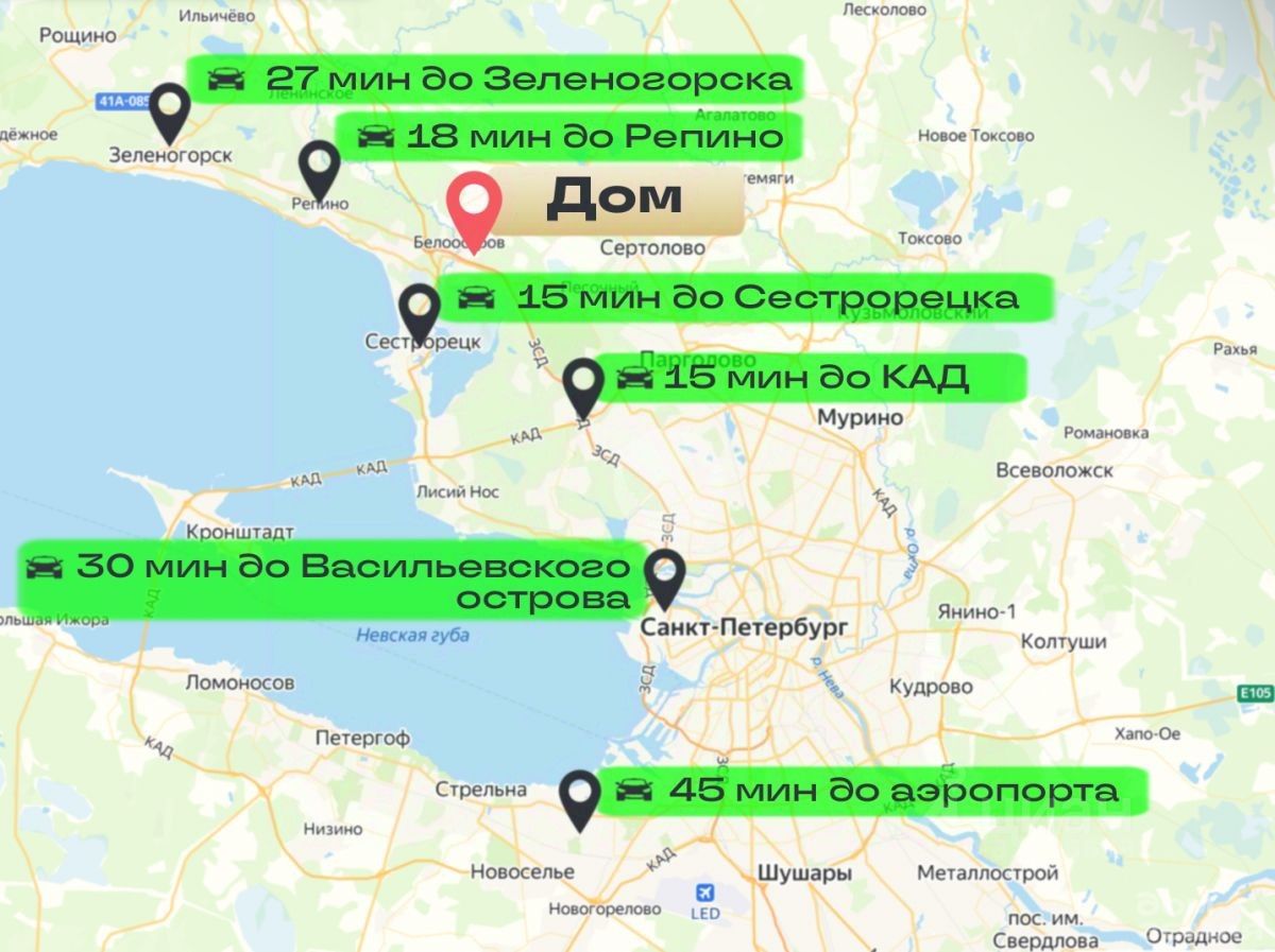 Всего 30 минут по ЗСД до центра Петербурга без пробок. В окружении лесного массива — чистый воздух и приватность. Эпицентр курортной жизни: в непосредственной близости - Репино, Комарово, Сестрорецк, Солнечное, Зеленогорск. Рядом — озеро Сестрорецкий Разлив (13 км) и река Сестра для отдыха и прогулок. Комфорт и безопасность: