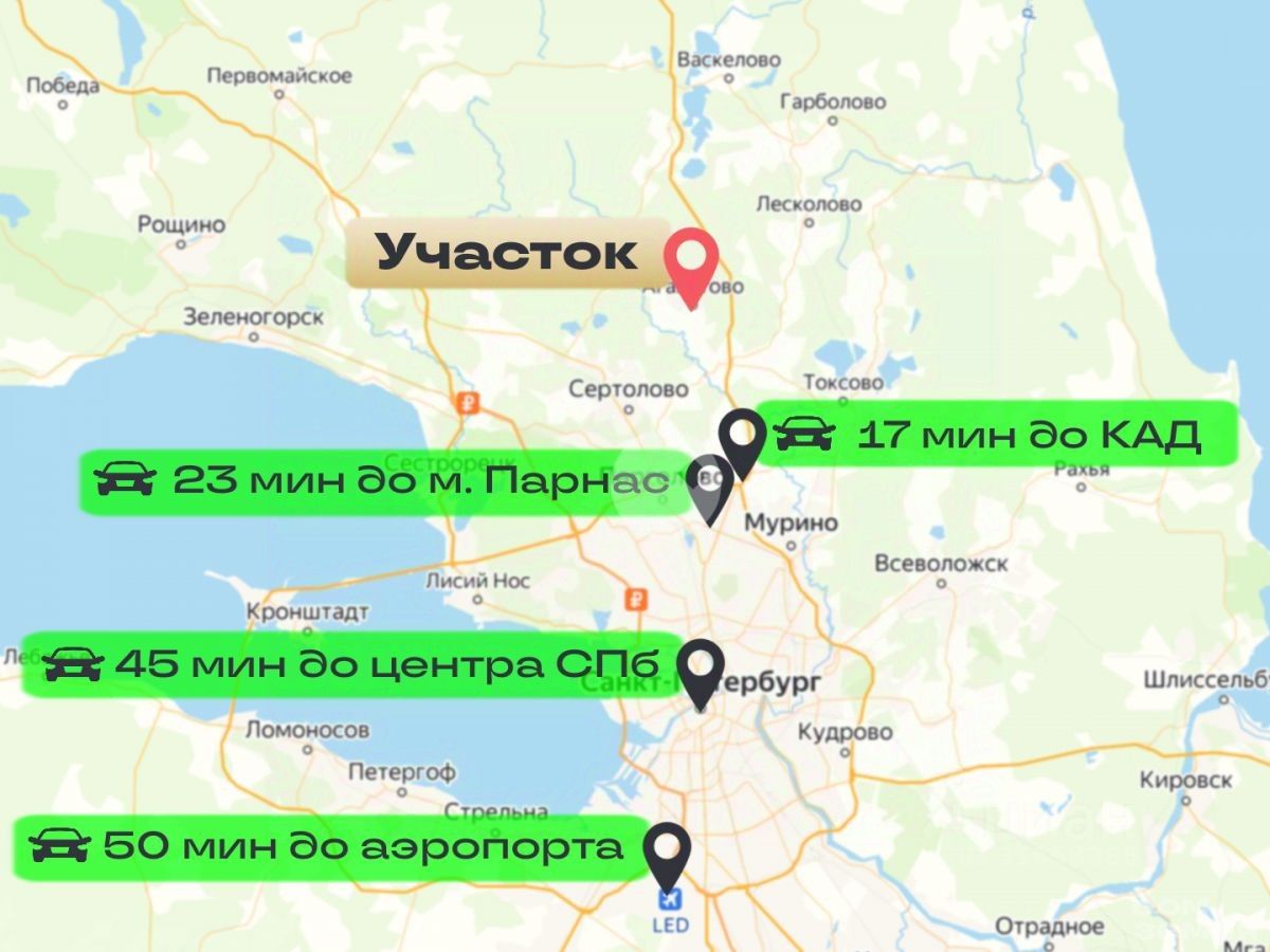 25 км до КАД Санкт-Петербурга  по Новоприозёрскому или Выборгскому шоссе на выбор.