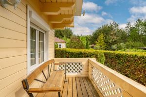 Дом построен из калиброванного бруса. На первом этаже расположены кухня-гостиная, санузел, дровяная баня, душевая. Второй этаж включает две спальни и гостиную с выходом на балкон, которую так же можно оборудовать под спальню.