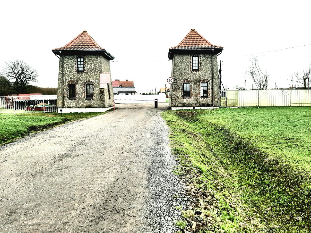 Поселок огорожен, въезд через шлагбаум.
