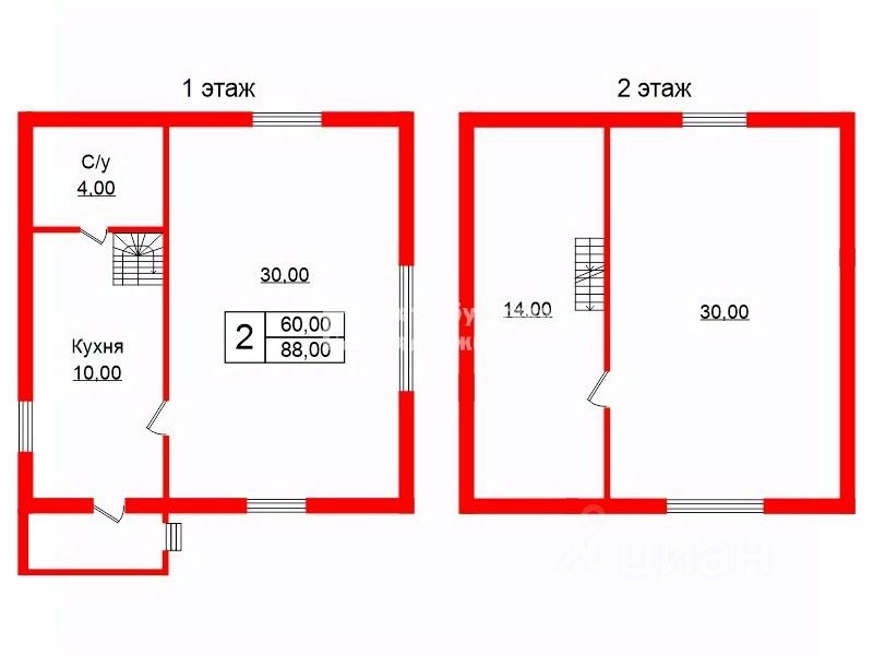 2 этаж: комната 30 м.кв., коридор 14 м.кв