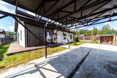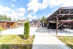 Перед домом находится 2 парковочных места под навесом и вольер для собак. По периметру установлены камеры наблюдения, которые охватывают весь участок. Есть датчик движения и реагирования на человеческий голос, на телефон приходят уведомления.