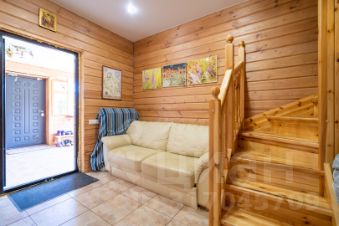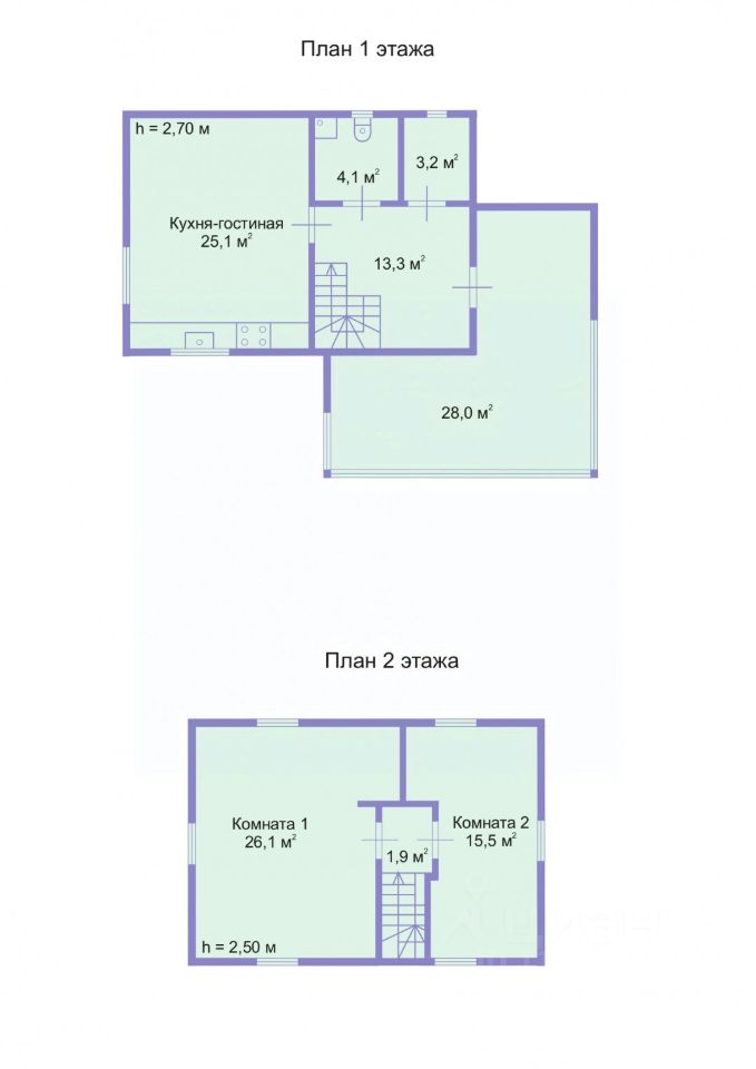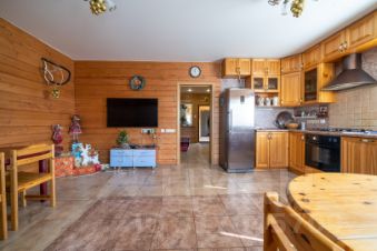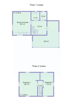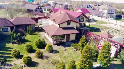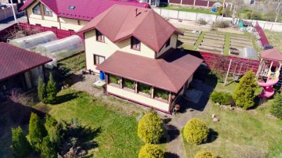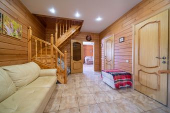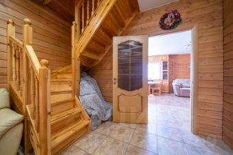 Дом 2х этажный. На первом этаже большая теплая веранда 28 кв.м., кухня-гостиная 25 кв.м., ванная комната и котельная. На втором этаже две большие комнаты. Между ними также выведены коммуникации под сан узел, но вместо него сделаны два стенных шкафа-гардеробных. При желании можно сан узел организовать без проблем.