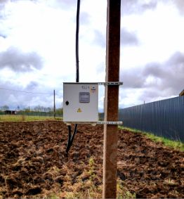 Установлен на столб ящик ЭЭ (внутри есть розетка для питания строительной техники или прокладки "времянки" для ведения работ на участке).