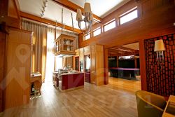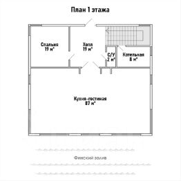 На первом этаже расположена просторная кухня-гостиная (87 кв. м) с выходом на террасу, ведущую к песчаному берегу, а также спальня (19 кв. м), холл (19 кв. м), санузел (2 кв. м) и котельная (8 кв. м).