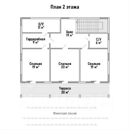 Второй этаж объединяет три спальни (19 кв. м, 19 кв. м, 20 кв. м), одну из которых мастер-спальня с гардеробной (9 кв. м) и санузел (11 кв. м). Из каждой спальни есть выход на общую террасу (28 кв. м) с видом на Финский залив.