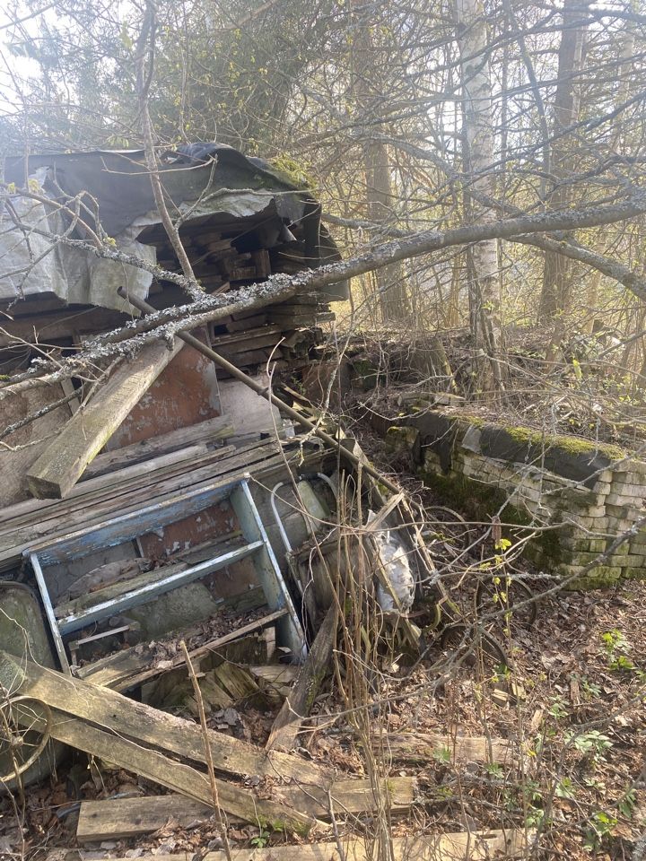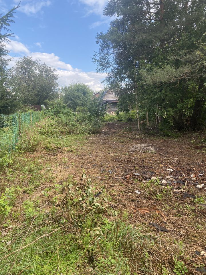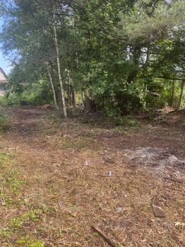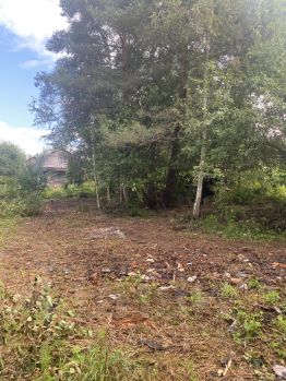 На участке 3 сосны, береза, яблони. И старые стройматериалы, хорошо как дрова. Построек нет.