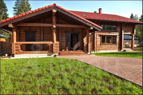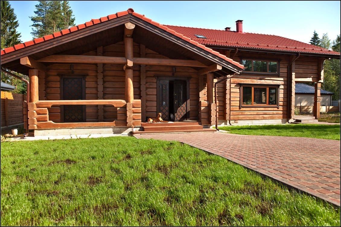 Дом построен из крупного лафетного бревна по технологии канадской рубки. Крыша из песчаной черепицы.