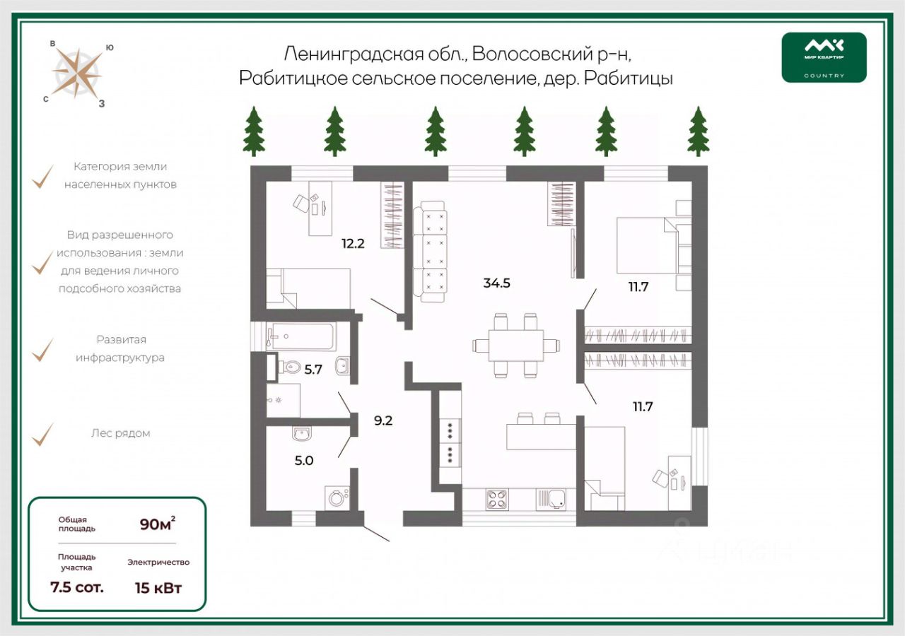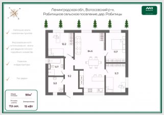 Три светлые комнаты, где найдется место для каждого члена семьи, и сердце дома просторная кухня-гостиная площадью 34,5 м², готовая стать центром притяжения для ваших близких.