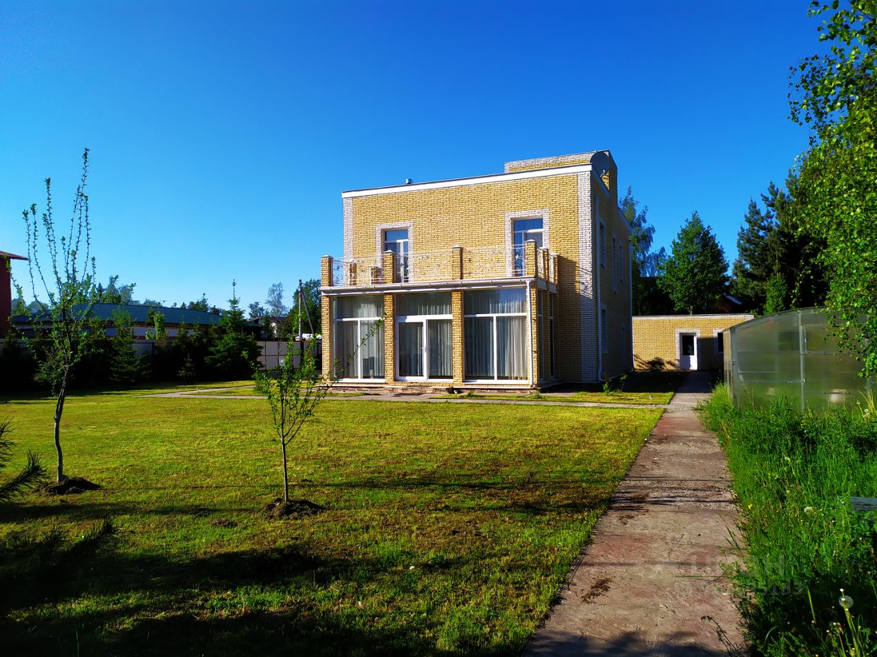На участке отдельно стоящее одноэтажное здание, строилось, как гостевой дом-баня, но используется, как хозблок, хотя все сети заведены. Навес на две машины, теплица. Участок огорожен забором с откатными воротами. Система видеонаблюдения и сигнализации. Участок ухожен: многолетний газон, плодоносные деревья и кустарники (слива, черешня, малина, крыжовник, черная смородина), кедр, орех, туи, сосны, ели.