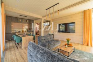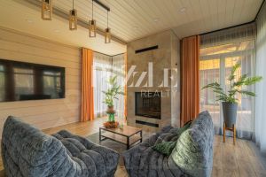 Дом разделен на 3 функциональные отдельные части, которые объединены общей просторной террасой. В первой (жилая) расположена просторная гостиная (42 м2) с камином. Помещение объединено с кухней и зоной столовой. Центром комнаты является камин, отделанный индийским мрамором с легким персиковым оттенком. Большие панорамные окна наполняют дом светом, и делают пространство гостиной визуально больше.
