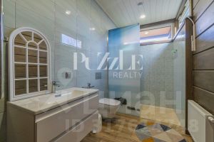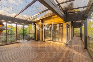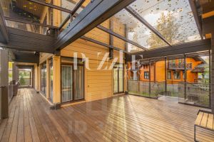 Вторая часть дома представлена полноценным банным комплексом с русской баней, душевой и комнатой отдыха. Переход в SPA зону осуществляется по большой закрытой террасе эти части дома находятся на одном уровне.