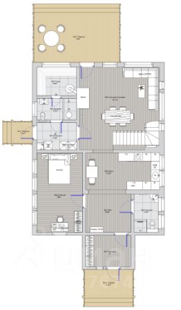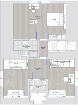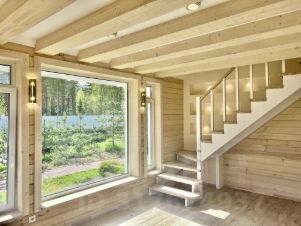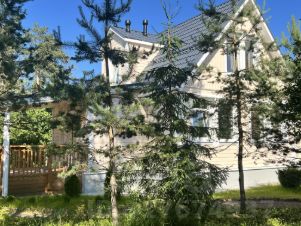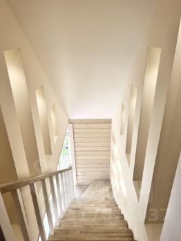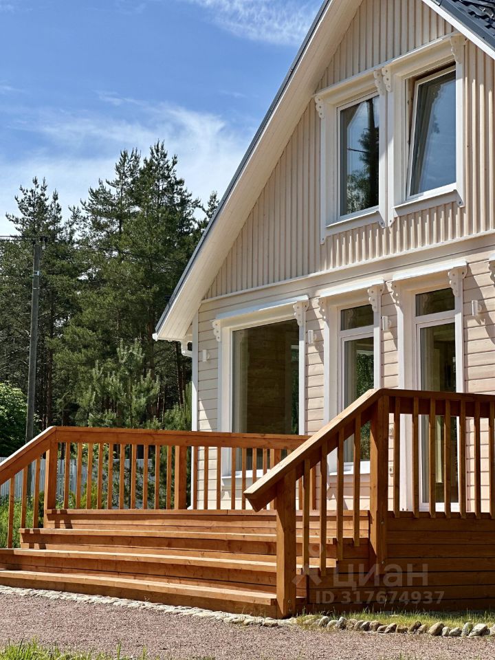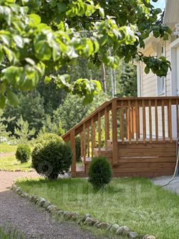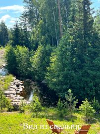 Дом площадью 205 кв м , на 1 этаже гостиная с камином и выходом на террасу с видом на лес и речку , спальня с окнами в яблоневый сад , два санузла , сауна ; на 2 этаже две спальни и две ванных комнаты .