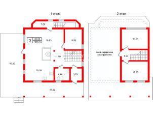 - Первый этаж (96,79 кв.м): кухня-гостинная (39,22 кв.м), спальня (8,95 кв.м), прихожая (11,69 кв.м), совмещенный санузел (4,44 кв.м), большая терраса с витражным остеклением (22 кв.м)
