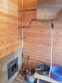- душ (вода из бочки с теном установленной на крыше бане, вода закачивается из колодца насосом), бак с горячей водой нагревающейся через теплообменник печки, кран с водой из колодца, пол - кафель, слив в канаву, стены покрыты спецлаком водоотталкивающим, пройдено герметиком, дверца со стеклом в топку печи.
