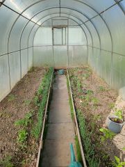 - Обработанный участок с ухоженными грядками и теплицей из поликарбоната.