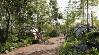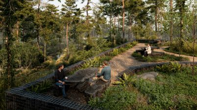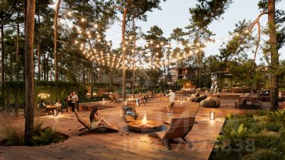 — Клубная площадь Лесная терраса с зонами отдыха, лаунж-пространствами и открытыми кухнями для барбекю.