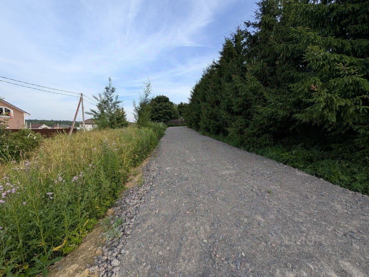 Участок находится в конце деревни, и перед ним установлен шлагбаум. Фактически это личный шлагбаум. Ключ от него у нас есть. Если поедете смотреть участок сами, то нужно будет либо 20 метров пройти пешком от шлагбаума, либо подъехать со стороны коттеджного посёлка, тогда доедете прямо до границы участка.