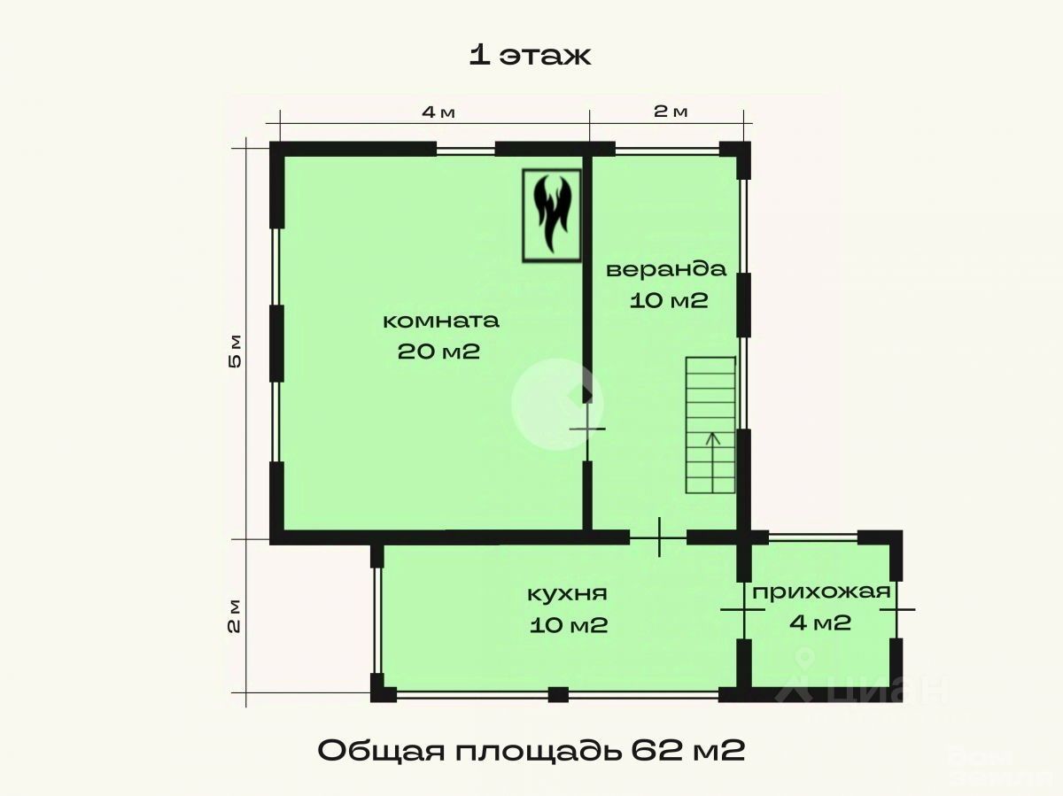 Площадь дома 62 м2. На 1 этаже расположены прихожая, кухня-веранда, комната с печкой, веранда с лестницей, на которой можно обустроить комнату. На 2 этаже холл и комната. Есть 2 большие кладовки в подкровельном пространстве и чердачное помещение - много места для хранения.