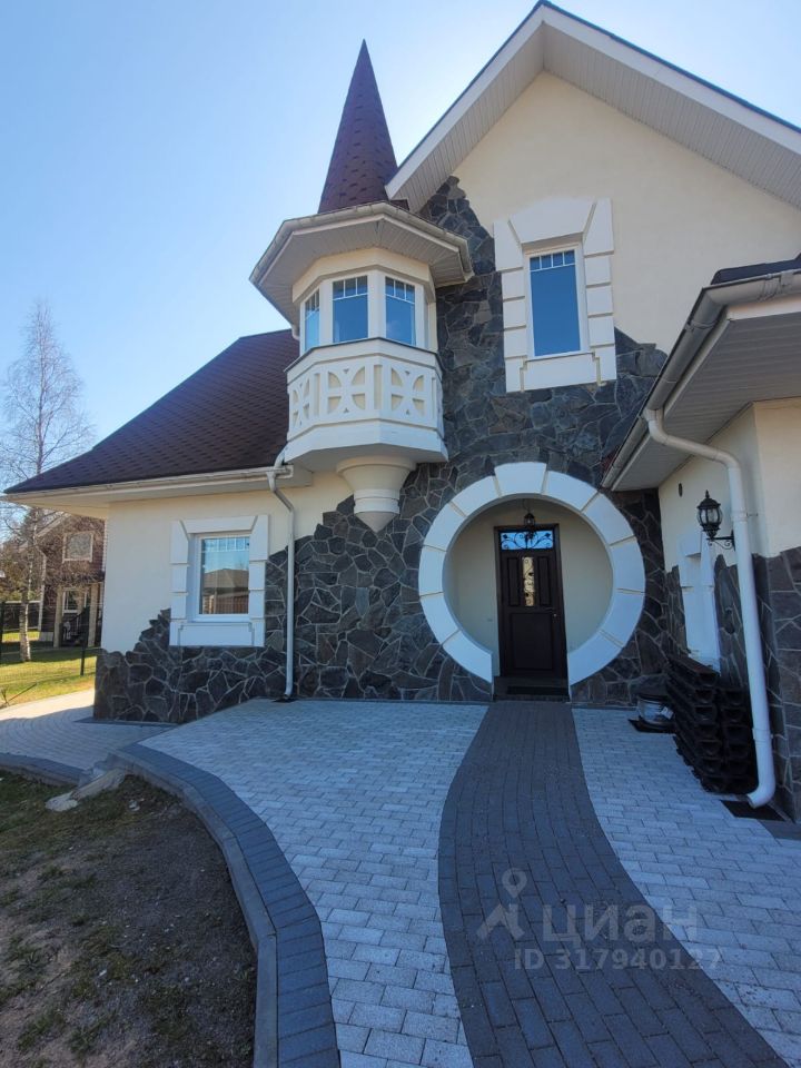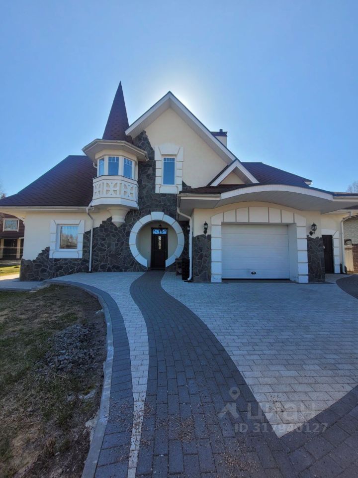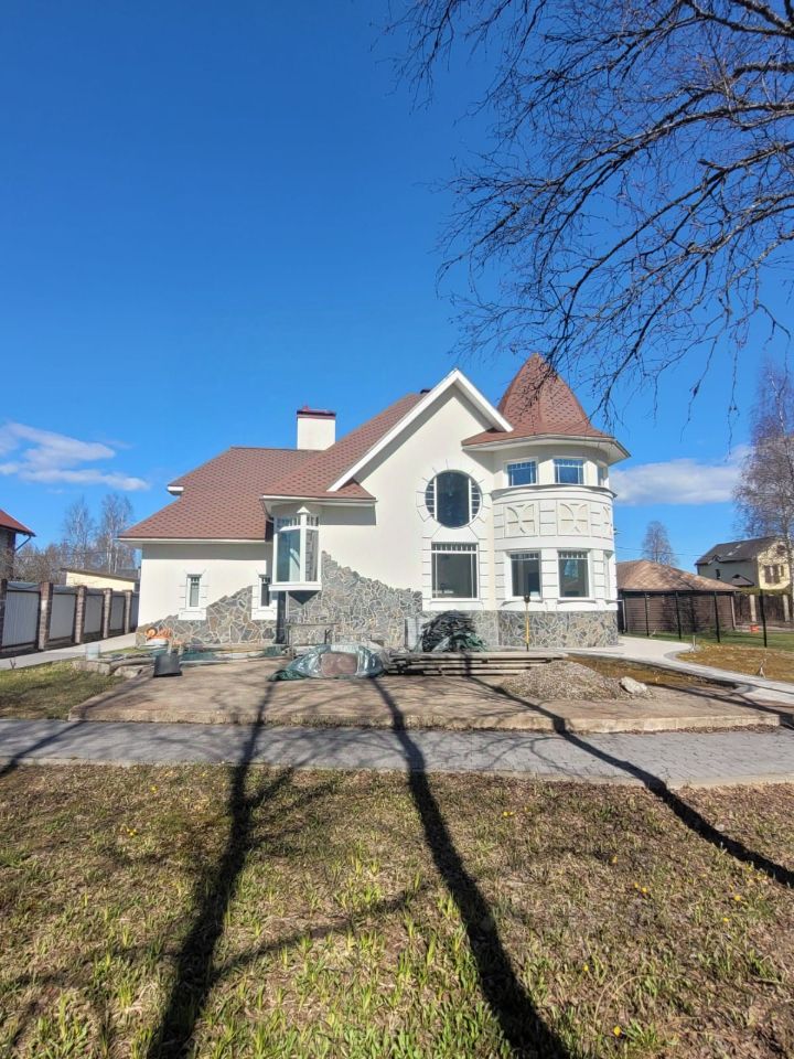 Дом проекта 2015 года. Рядом с рекой Охтой в природоохранной зоне. Дом площадью в 220м 2 расположен на участке размером 1479м2. Фундамент дома плита. Внутренняя часть стен выполнена из кирпича, наружняя часть -из газобетонных блоков с утеплителем. Башневая часть дома выполнена из кирпича с утеплителем. Наружняя часть дома обшита шунгитом. Весь первый этаж дома декорирован керамогранитным покрытием. На втором этаже пол покрыт паркетной доской. Кровля выполнена из мягкой черепицы.